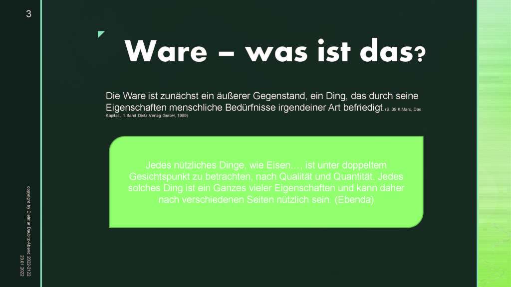 Der Ausschnitt aus dem o.g. Werk zeigt, dass die gesamten wirtschaftlichen kapitalistischen Prozesse der menschlichen Gesellschaft wissenschaftliche Grundlagen haben, die bereits im 19. Jahrhundert erkannt wurden. Der Gros der Menschheit jedoch unterschätzt das fehlende Wissen der Gesetze des Kapitalismus zu kennen. Wer die Gesetze des Kapitalismus kennt, versteht auch viele Entscheidungen und Entwicklungen innerhalb Europas und erst recht weltweit. China hat der kapitalistischen Welt bewiesen, wie man trotz „Diktatur des Proletariats“ (oder besser einer Partei, die sich kommunistisch bezeichnet – aber nicht ist, weil Kommunismus hat mit Diktatur gar nichts zu tun – die durch „Führer“-u.a. Varianten existieren) innerhalb relativ kurzer Zeit von „einem armen Staat“ zur Weltmacht sich entwickeln kann. Statt Sozialismus hat China einen Staatskapitalismus aufgebaut, der noch besser als Russland (Russland hatte sich für die westliche Welt geöffnet und wollte sich „der NATO unterordnen“- was Alleinherrschaft der USA zumindest ein wenig geschadet hätte – mit jetzigem Wissen schadet es besonders Europa und damit Deutschland) es schaffen konnte durch sein „Riesenreich“. Da in der Bildung in Europa zu wenig über gesellschaftliche Gesetze und Entwicklungen gelehrt wird, werden viele Entscheidungen „aus dem Bauch heraus“ von der Politik umgesetzt. Wissen ist bei den meisten Spitzenpolitikern in der neuen Bundesregierung nicht mehr gefordert? Diese Frage muss man stellen, nach dem bereits bei den ersten Handlungen und Erklärungen seitens Außenpolitikerin o.a. große Schäden in der internationalen Kooperation zu befürchten sind. Besonders Angela Merkel konnte durch ihr Wissen und Können beweisen, dass Volkswirtschaft, Gesellschaftswissenschaft und Gesetzmäßigkeiten mit intelligenter Diplomatie zu Erfolgen führen. Sofern die Europäische Union noch rechtzeitig „die Kurve bekommt“ gemeinsam international neue Technologien und Logistik zu realisieren, haben wir noch eine Chance den „neuen Kapitalismus des 22. Jahrhundert mitzubestimmen“. Eine große Chance würde darin bestehen, wenn Europa gemeinsam die soziale Marktwirtschaft zu einer sozialeren und besseren Kapitalismus – Variante weiterentwickeln könnten. Aber welcher Politiker hat ernsthaft die Kraft, das Wissen und die Motivation der Massen in Europa eine positive menschliche Sicht zu fokussieren? Als Ergebnis müsste natürlich auch völlig neue Produkte und Dienstleistungen sowie Logistik herauskommen. Naturkapitalismus wäre eine mögliche Variante?