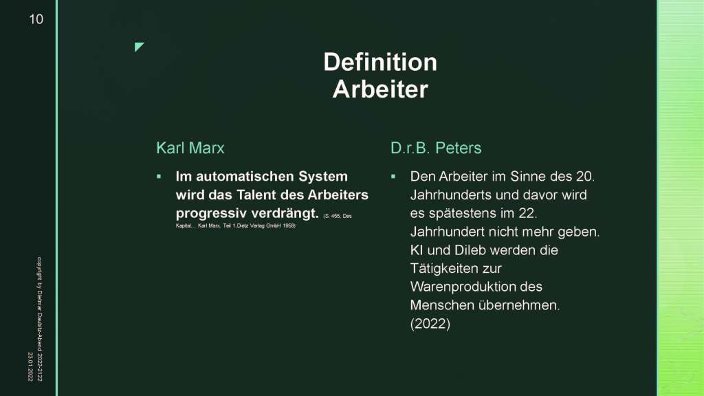 Im Zuge der weiteren Entwicklungen der gesellschaftlichen Zusammenhänge werden hier „aus dem Kopf“ Gedanken und Schlussfolgerungen gezogen. Werden diese Gedanken und Thesen Teil unserer Gesellschaft oder werden wir schneller positive Schritte der Menschen gehen? Kleine Gesprächsgruppen grenzen sich aus und alle Seiten sprechen von „Meinungsfreiheit“. Wo beginnt Meinungsfreiheit und wo hört sie auf? Wo sind Kommunikation zwischen Menschen strafbar – wo ist Kommunikation Meinungsfreiheit? Diese Fragen sind besonders durch die enorme Belastung aller demokratischen Kräfte innerhalb Deutschlands und auch in Europa zu beantworten. Freiheit ist auch „Freiheit des Andersdenkenden“ – aber „Andersdenkender“ bedeutet nicht, dass Andersdenkende Propaganda für Tötung von Bioleb öffentlich realisieren darf. Auch die Marktbeherrschung von wenigen Anbietern von Social Medien ist eine Frage der Demokratie. Dürfen „Firmen“ oder „Konzerne“ das „Briefgeheimnis“ der Medien negieren? Dürfen Firmen über „Recht“ oder „Unrecht“ entscheiden? Wozu benötigen wir dann noch „eine Gewaltenteilung“ zwischen Firmen, Personen und Staat? Freiheit und Demokratie – diese beiden Begriffe (Normen des Kapitalismus der deutschsprachigen Länder) – haben in der sozialen ökologischen Digitalrevolution viele Fragen der Zeit zu beantworten. Werden die enormen Fortschritte von Europa rechtzeitig völlig neue positive Wege im Sinne der Bevölkerung finden, um die weltweite Neuaufteilung der Welt in eine menschliche Gesellschaft zu führen? Oder werden die Europäer in der Geschichte der Menschheit nur noch „ein ausführendes Organ“ der „neuen Machthaber“? Da der Mensch am Scheidepunkt seiner Weiterentwicklung sich befindet, können wir erleben, welche verschiedenen Möglichkeiten weltweit genutzt werden, um die enormen Herausforderungen der Zeit bewältigen zu können. Die Industrialisierung der letzten über 200 Jahren haben dem Kapitalismus die Welt „zu Füßen“ gelegt. Die soziale ökologische Digitalrevolution (bedingt durch ökologische und digitale Änderungen – sprich Perfektionierung der Warenproduktion und der Logistik der menschlichen Art) wird völlig neue menschliche Taten und Entwicklungen in der Welt hervorbringen.