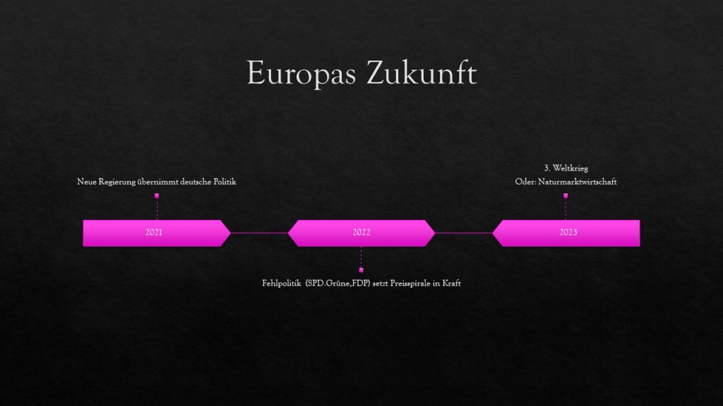 Diskussionen in den engeren Kreisen erkennen die Gefahr „1933-45“ auf „höhere Niveau“ ab dem Jahr 2019? Die Monopolisierung der Monopole hat enorme Ressourcen von Wissen und Technologien von Nordamerika/Europa nach Asien verschoben. Der Gros der Bevölkerung der Welt lebt dort. Es ist deshalb logischerweise davon auszugehen, dass die Vorteile der Europäer gegenüber der Weltbevölkerung durch die massive Ausbeutung der Ressourcen und Bioleb im 20. Jahrhundert zu Gunsten des vielfachen der Menschen in Asien verloren gehen. Technologisch sind asiatische Staaten mittlerweile den Europäern überlegen. Der gesellschaftliche Vorteil der Demokratie wird durch weitere diktatorische Gesetzgebungen und Vorschriften schrittweise aufgegeben. Sollten die Europäer nicht rechtzeitig den Schritt in die neue ZEIT der Quantengeneration sozial, ökologisch und ökonomisch logistisch neu strukturieren, können die asiatischen Staaten die neue Führungsriege werden. Europa kann durch die Einführung der Naturmarktwirtschaft eine Gesellschaftsordnung auf dieser Welt schaffen, die künftig die Fragen der Zukunft beantworten könnten. Diese grundsätzliche Neuorientierung der Welt haben sowohl die Grüne Partei als auch die anderen etablierten Parteien, wie SPD, CDU/CSU, FDP, Linke oder sogar die AfD nicht erkannt. Welche Bewegung müssen Europäer „erfinden“, damit die Zeit der „Quantengeneration“ – die neue Zeit für die Welt werden? Von „Zeitenwende“ redete der Bundeskanzler der Bundesrepublik Deutschland im Jahr 2022-nur „alte Kamellen wiederholen“ – das sind KEINE Zeitenwende! Sowohl das Bedingungslose Grundeinkommen (oder besser Eurosatz für ALLE) als auch EuroSocial – ein Beitrag von ALLEN, um das Gesundheits- und Pflegesystem von Europa und später darüber hinaus zu finanzieren. – werden negiert und die Parteien mit dem C wollen nicht mal „Bürgergeld“ (welches HartzIV light nur ist)? Wer weiter „alte Kamellen wiederholt“ und die „Zeitenwende“ nur als Slogan sieht, hat „die Welt verpennt“. Kriegspropaganda und Beenden von positiven zwischenmenschlichen Beziehungen und Kommunikation führen zum 3. Weltkrieg. Diesmal sollte NIEMAND in Europa behaupten, „DAS wusste ich nicht!“ oder “ DAS wollte ich nicht!“ – die Kugel rollt…